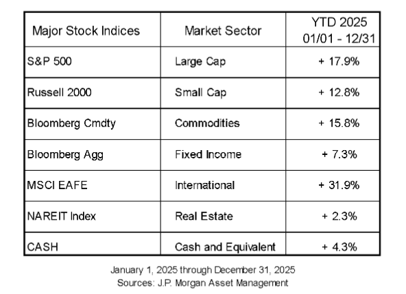 This was a year where the various moving parts all came together better than expected. Federal Reserve interest rate policy, tariffs, geopolitical tensions, and the new administration combined to provide an exciting and profitable year on the stock market. The best performing asset class was international. The last time this happened was in 2017. Domestic equities held their own and continued an impressive run since 2023. The sell-off caused by the tariff rollout was shortlived as markets digested the mechanical application of tariff policy beyond the original announcement by President Trump on “Liberation Day”. Commodities posted an impressive run, led primarily by gold and silver, although their run has hit a rough patch in the new year.